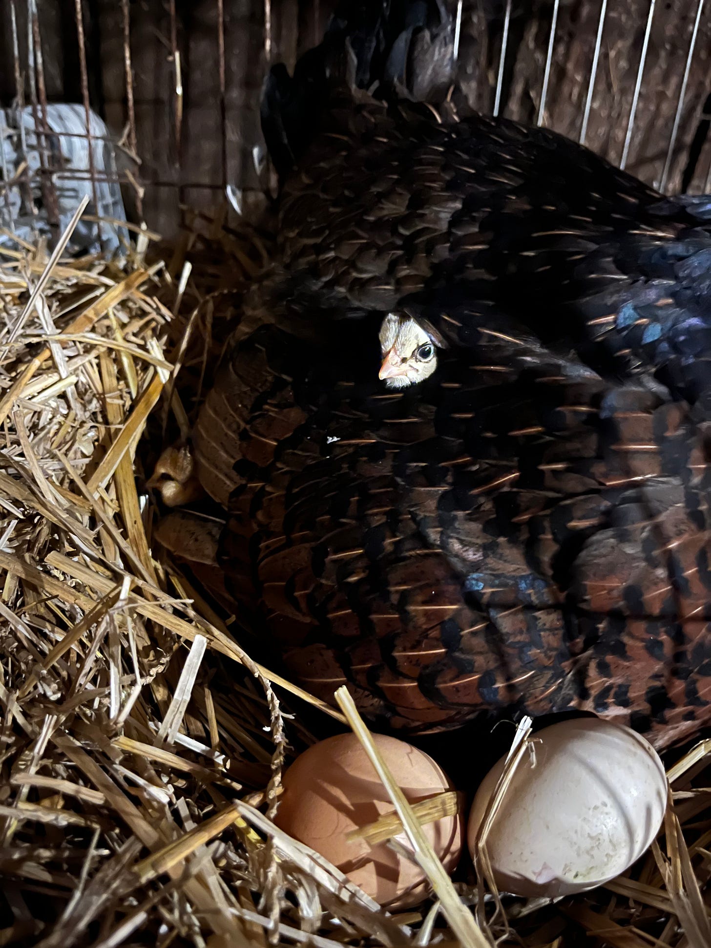 I took mama & her seven babies to a warm, comfy crate where they could enjoy safety. Mama was delighted when I set her up with fresh water and delicious feed. Knowing that one baby had fallen out of the lofty nest, my instinct told me I needed to carefully check the barn for additional chicks. Sure enough, a search of the barn led me to five more cold & scared little ones. I gathered them up and returned them to mama. Newly hatched chicks need to be at warm temperatures of around 90 degrees. A chilly late October day was not the best time to hatch, so I reinforced their crate with quilts to insulate it. Mama Hen fluffed up her feathers so her little ones could burrow into the warmth of her body heat. She seemed very relieved to have her twelve babies all back with her, despite her initial anger with me at moving them to safety.